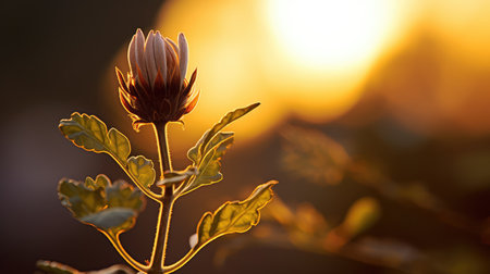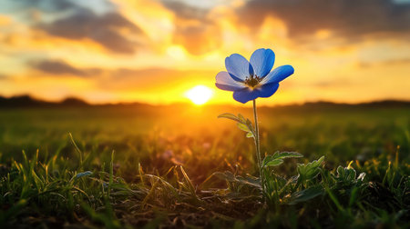 A solitary blue flower stands gracefully against a breathtaking sunset, capturing the essence of nature's beauty. The warm light casts a tranquil ambiance.