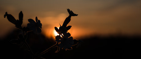 Silhouette of wildflowers against a dusky sunset sky. The image captures the silhouette of wildflowers in a field, set against a gradient sky of orange and gray during sunset creating a peaceful scene