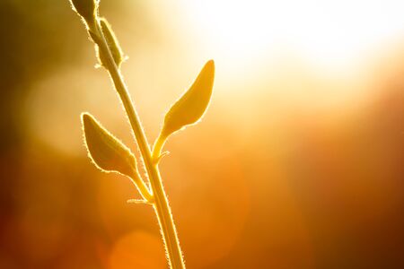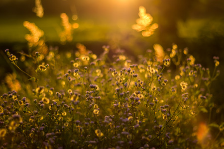 small beautiful yellow wild flowers blooming at sunset background, nature background