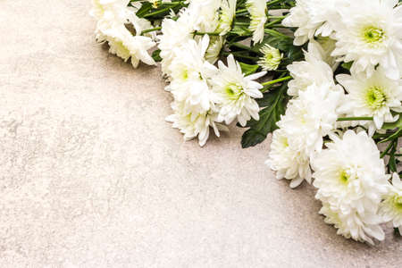 A bouquet of white chrysanthemums on a stone background. Flower Card Concept, copy space.