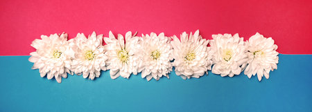 Concept of minimal nature and romance. White chrysanthemum flowers on a pastel pink and blue background.