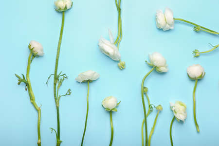 composition of white flowers on a white wooden background with copy space. holiday and congratulations concept