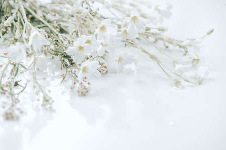 Beautiful tiny wild flowers bunch over white background, soft pastel colours, beauty invitation card design, wedding, birthday border art. Macro shot, nature, field flowers.