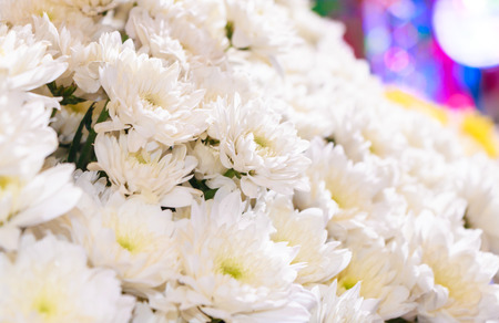 soft focus of blooming white chrysanthemum flower bouquet with yellow highlight and purple shadow
