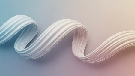 A smooth, elegant white ribbon swirls gracefully across a soft pastel gradient background, creating a delicate and artistic abstract composition.