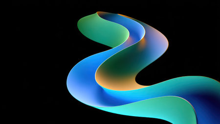 A vibrant, abstract design features a ribbon-like form rendered in shades of blue, teal, and green, set against a stark black background. The smooth, curved shapes suggest movement and fluidity. The lighting highlights the gradient colors. Suitable for various creative and commercial applications.