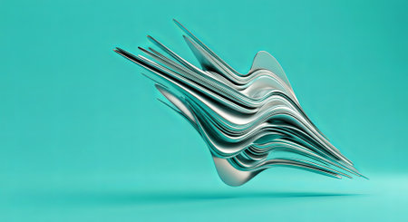 Futuristic metallic artwork suspends timelessly in a sea of teal, evoking fluid motion and wavelike elegance. An extraordinary fusion of art and design. Generated A.I.