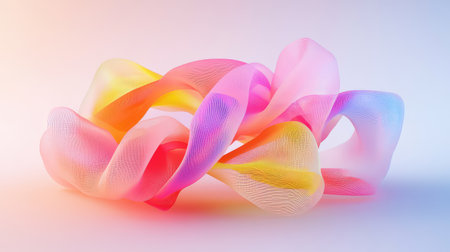 Colorful folded ribbon loop in a 3D render, mesh texture glowing with gradient hues in a clean, abstract space
