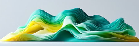 A flowing abstract shape dominates the frame, rendered with smooth gradients of green, yellow, and a touch of blue. The elegant curves are set against a dark, blurred backdrop, enhancing the sense of depth. This image could be suitable for various commercial or artistic applications.