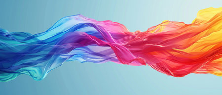 Dynamic composition featuring vibrant, flowing ribbons in multiple colors against a bright, clear blue backdrop. The image showcases textures, light reflections, and a sense of movement suggesting an airy or atmospheric setting. Suitable for use in design projects, advertising, and other creative purposes that require a modern or artistic aesthetic.