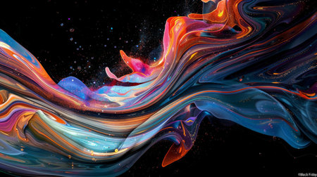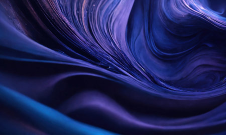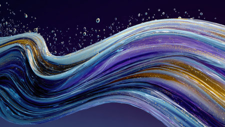 This image presents an abstract composition featuring fluid, wave-like shapes. The artwork showcases a dynamic interplay of colors, including blue, purple, and gold, suggesting movement and energy. The design is set against a dark background, creating a sense of depth and contrast. Suitable for various creative and commercial applications.