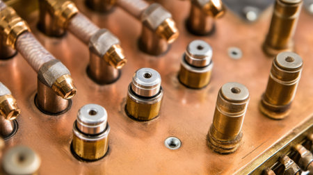 A detailed close-up of precision mechanical components in industrial equipment, showcasing intricate metal and copper details. Ideal for engineering themes.