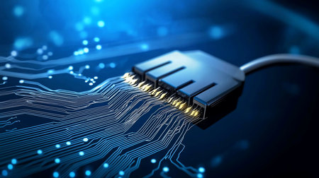 Close-up of a circuit board connector with glowing traces emanating from it, set against a dark blue background with bokeh lights, symbolizing technology and connectivity.