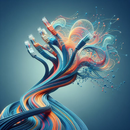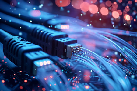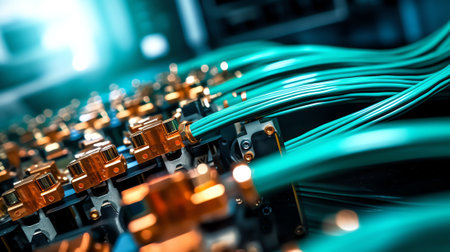 close-up of fiber optic cables being connected and arranged within a 5g network, created with generative ai