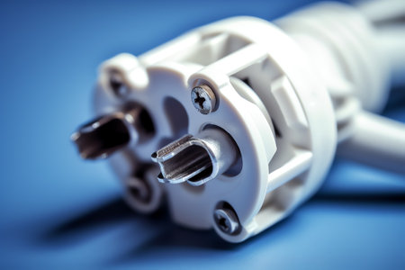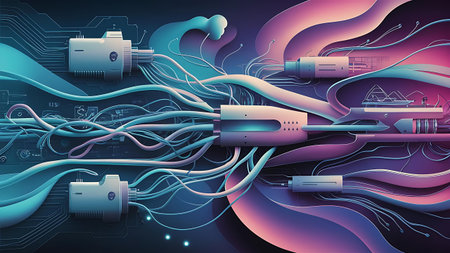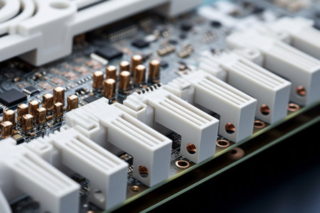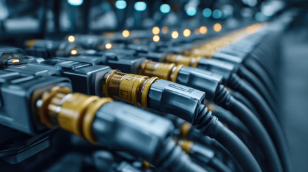 This close-up image showcases a series of industrial connectors and cables, highlighting intricate details and robust design typical in high-tech manufacturing settings.