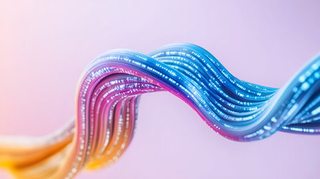 Abstract multicolored ribbons in pastel shades of pink, blue, purple, and gold, with a soft, smooth texture, flowing in a dynamic, wave like pattern against a soft, pastel pink background. The lighting is soft and diffused, creating a smooth transition of colors and highlights. The ribbons appear to be digitally rendered or created by computer graphics, with a subtle metallic sheen and a hint of glitter or sparkle.