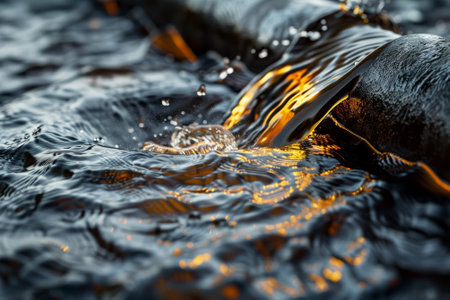 A stream of water is pouring out of a pipe into the ocean. The water is dark and murky, and the light from the sun is reflecting off the surface. The scene is serene and peaceful
