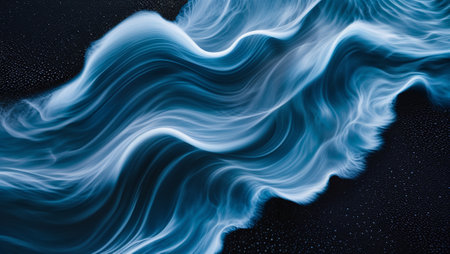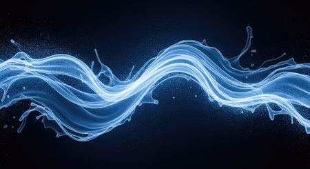 An abstract, ethereal wave of glowing blue light with shimmering particles flows dynamically against a dark gradient background, suggesting energy...