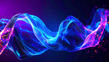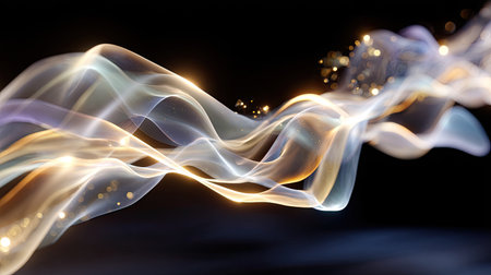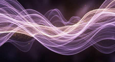 This abstract flowing, ethereal waves of light that shimmer and glow in shades of purple and gold. Translucent ribbons of light intertwine and undulate, creating a sense of fluid motion and depth. Tiny golden particles are scattered throughout, adding a touch of sparkle and magic. The background is dark and moody, allowing the luminous waves to stand out. The overall effect is and dreamlike, evoking a sense of energy, creativity, and wonder. It could represent anything from sound waves to...