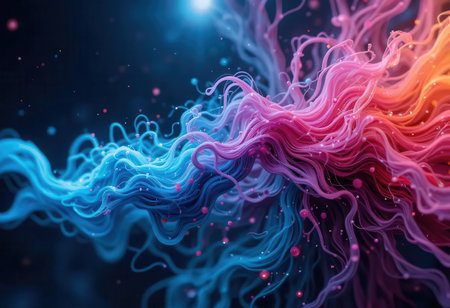 Vibrant abstract image of colorful light waves with glittery particles creating a dynamic and aesthetically pleasing background for various creative projects.