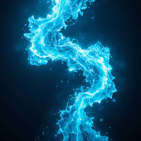 A vibrant, bright blue electric energy stream flows dynamically, emitting light and surrounded by small glowing particles against a dark background.