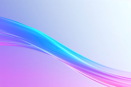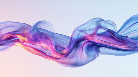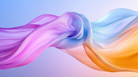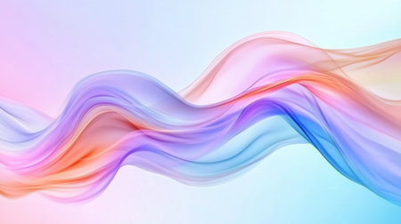 A flowing, iridescent pastel ribbon shape gracefully curves against a soft gradient background of blue and pink, with subtle highlights adding depth...