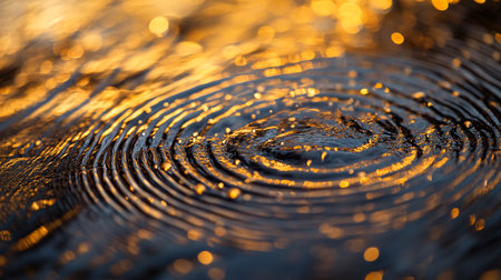 Detailed view of water's surface during golden hour, where concentric ripples gently expand. Warm sunset light paints the water, evoking peace and reflection.