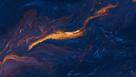 Abstract swirling patterns of dark blue and vibrant orange fluid paint with texture.