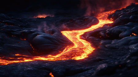 A river of bright orange molten lava flows through a dark, textured landscape. The image showcases the dynamic, flowing nature of the lava against the rough, black rock. The scene is illuminated by the lava's glow, suggesting a night setting. Suitable for various editorial and commercial applications.