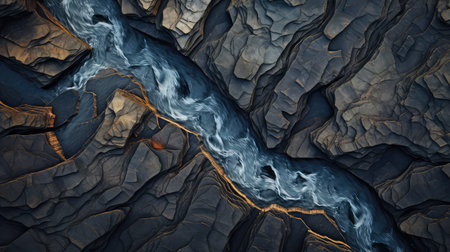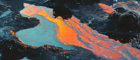 An abstract illustration showcases glowing orange streams against a dark blue background, creating a contrast in colors. The design appears as if molten streams flow over an uneven surface, possibly resembling a natural formation. This image could be suitable for various commercial or editorial uses, including backgrounds or artistic concepts.