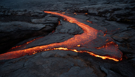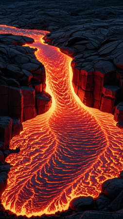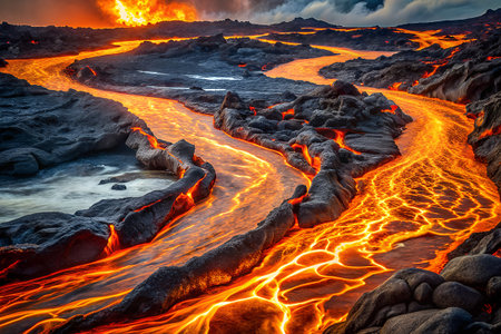 Volcanic Flow Abstraction Mesmerizing patterns of molten lava flowing across black volcanic rock, creating rivers of liquid fire