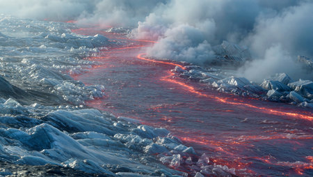 Lava pours across frozen ground with steam rising into the air, showing nature's power.