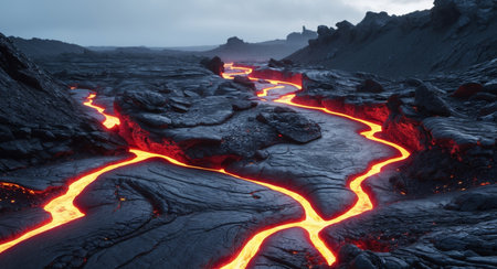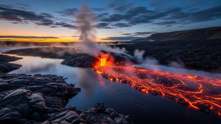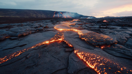 Lava flows from a volcanic eruption at dusk in Icelands rugged landscape