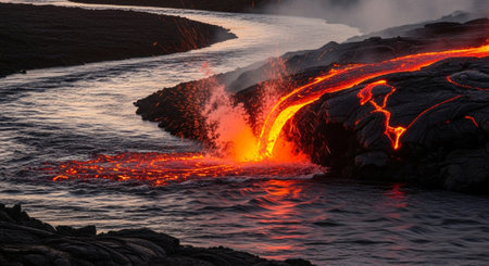 Witness the breathtaking intersection of fire and water as lava cascades into the sea, forming new landforms.