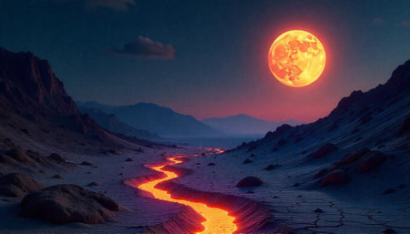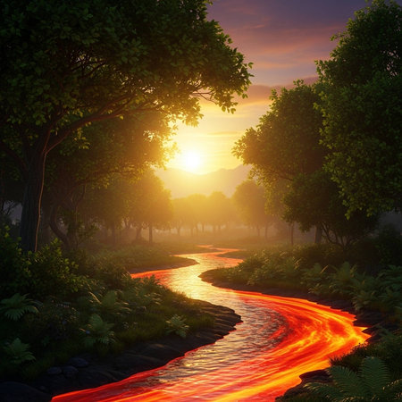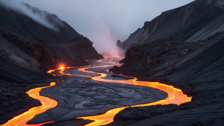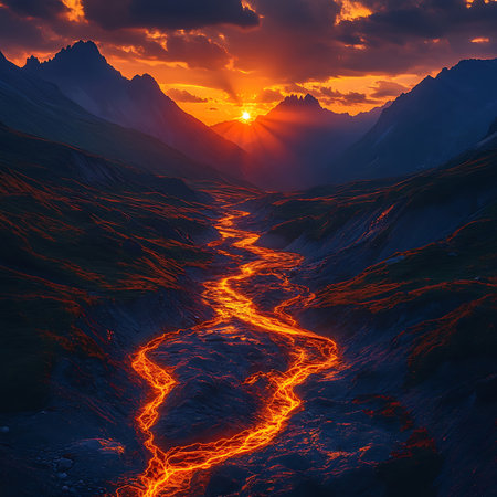 Experience a breathtaking sunset over a glowing lava river winding through majestic mountains. This stunning landscape captures nature