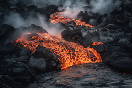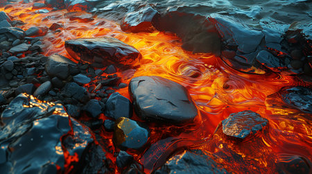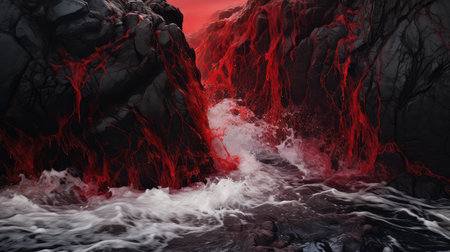 abstract shot of a lava flow flowing between black rocks in fiery red tones and flowing into the cold waters of the sea - ai generative image