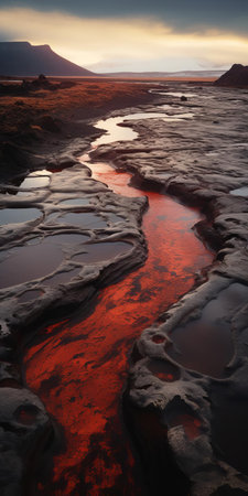 experience the otherworldly beauty of the uk like never before. this stunning photograph showcases the country's extreme landscapes, with dry land and bubbling pools of lava. shot with a hasselblad 6h camera, the level of detail is breathtaking. the use of natural and cinematic lighting creates a dramatic and otherworldly atmosphere. despite being one of the hottest and most inhospitable places on earth, the uk's