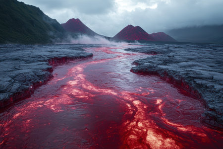volcano red lava illustration magma flow, molten landscape, destruction vibrant volcano red lava