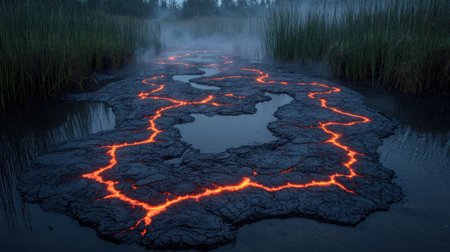 AI Generated. Glowing Lava Flows Through Dark Volcanic Rock