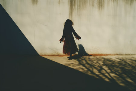 Man walking alone near a towering wall, casting a long shadow on the surface during a bright, sunny day in the urban landscape