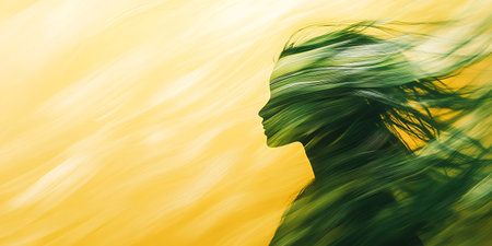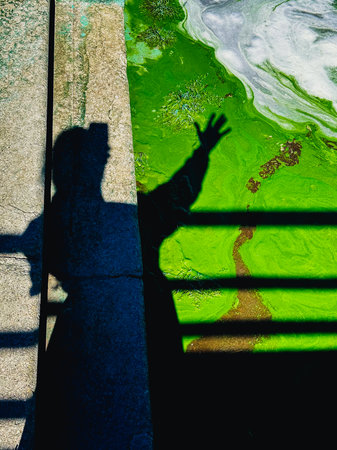 The shadow of a reaching hand contrasts with a green algae bloom. A striking silhouette of a person's hand and arm is cast across a vibrant green algae bloom, a contrast of light and shadow. Ecology.
