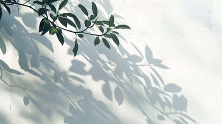 Soft subtle shadows of leaves reflected on a white wall creating a serene and minimalist background with a natural touch.