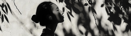 A monochrome portrait that beautifully captures the essence of contemplation and grace. The subject's profile is exquisitely defined by natural light casting soft shadows, creating an abstract backdrop. This timeless piece is ideal for concepts of introspection, natural beauty, and artistic expression in design and editorial works.