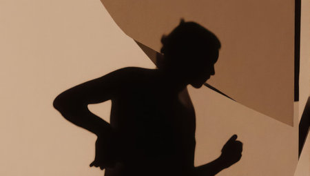 Silhouette of a person moving with arms in front of a patterned backdrop, warm lighting
