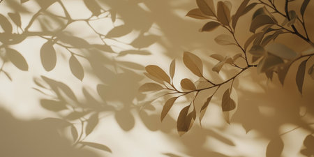 Warm shadows of leaves on a smooth beige wall. Tranquility concept. Generative AI