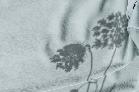 Aesthetic minimalist neutral background with sunlight shadows on light blue textile, meadow flower silhouette, copy space