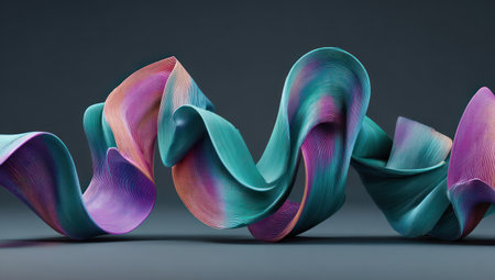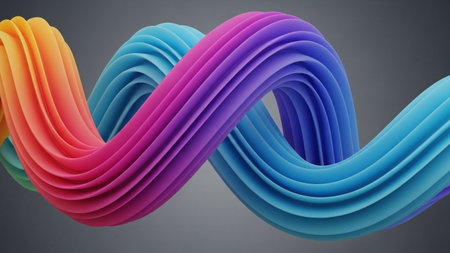 Wave showing colorful gradient ribbon twisting in a fluid wave shape with layered texture against a dark gray...