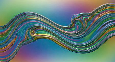 A flowing abstract of iridescent liquid with a colorful metallic sheen, showing waves, droplets, and bubbles...