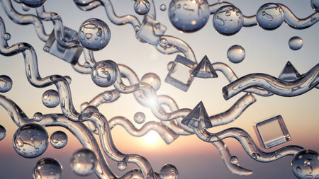 Floating showing abstract 3d rendered liquid bubbles and geometric shapes floating in a softly lit sky background....