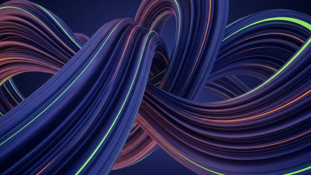 Dark blue and purple abstract 3D rendered ribbons swirl with vibrant neon green and orange light accents.